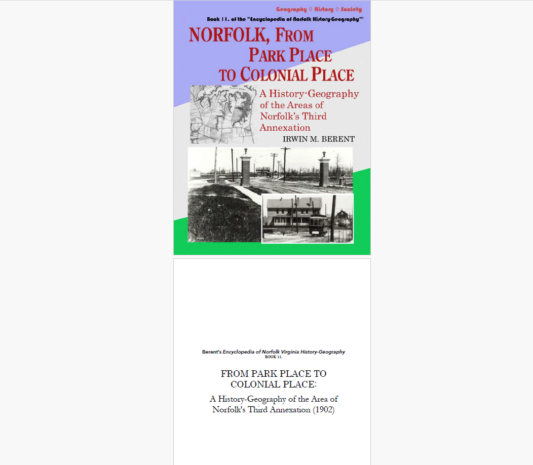 Norfolk, Virginia, From Park Place to Colonial Place: A History-Geography (eBook 11, Encyclopedia of Norfolk, Virginia, History-Geography) covers in exhaustive detail the history-geography of all the areas within Norfolk’s Third Annexation, the Park Place Annexation of 1902, a vital part of what has made Norfolk, Virginia, one of America’s most historic and important cities.