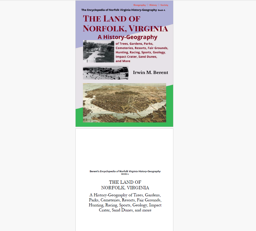 The Land of Norfolk, Virginia: A History-Geography (eBook 4, Encyclopedia of Norfolk, Virginia, History-Geography) covers in exhaustive detail the history-geography of the land of Norfolk, Virginia, presenting a selective look at Norfolk’s trees, soil, beaches, gardens, parks, cemeteries, fairgrounds, hunting, racing, and more, all described through contemporary historic maps, photographs, articles, deeds, advertisements, books and other documents. (more)
